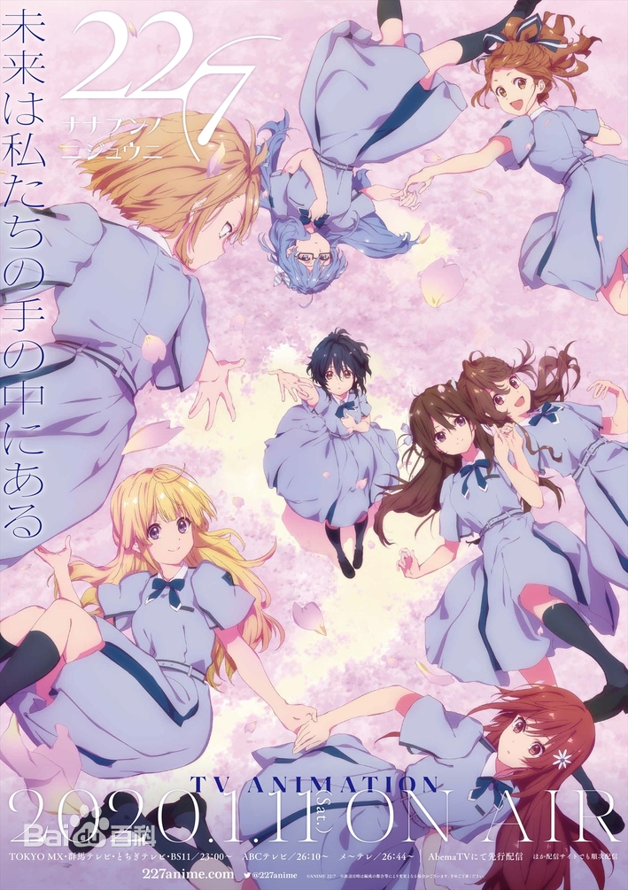 电视动画片《22/7》是同名多媒体虚拟偶像企划的一环,于2020年播出,全12集。作品讲述了女主角泷川美羽突然收到了一封来自名为“G.I.P”经纪公司所寄来的信,信上写著她获选为新企画的成员。她来到信上地址写的场所,在那里还有和她一样被召集到这的7名少女。她们被告知“你们将作为偶像团体正式出道”,前所未见的新生代偶像,在此诞生——