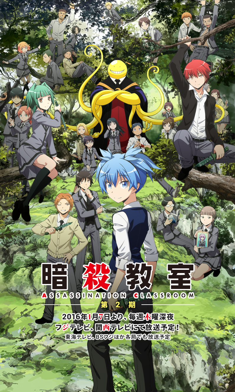 电视动画《暗杀教室 第二季》改编自日本漫画家松井优征原作的漫画《暗杀教室》,于2016年播出,全25话,另有8话OVA作品。故事仍以椚丘中学3年E班为舞台,在第二学期开始,国家决定成功暗杀的人,个人就得到一百亿日元报酬,其参加的团体可共得三百亿日元报酬。各同学想尽办法杀死这名老师,故事围绕着非日常的校园生活而展开。