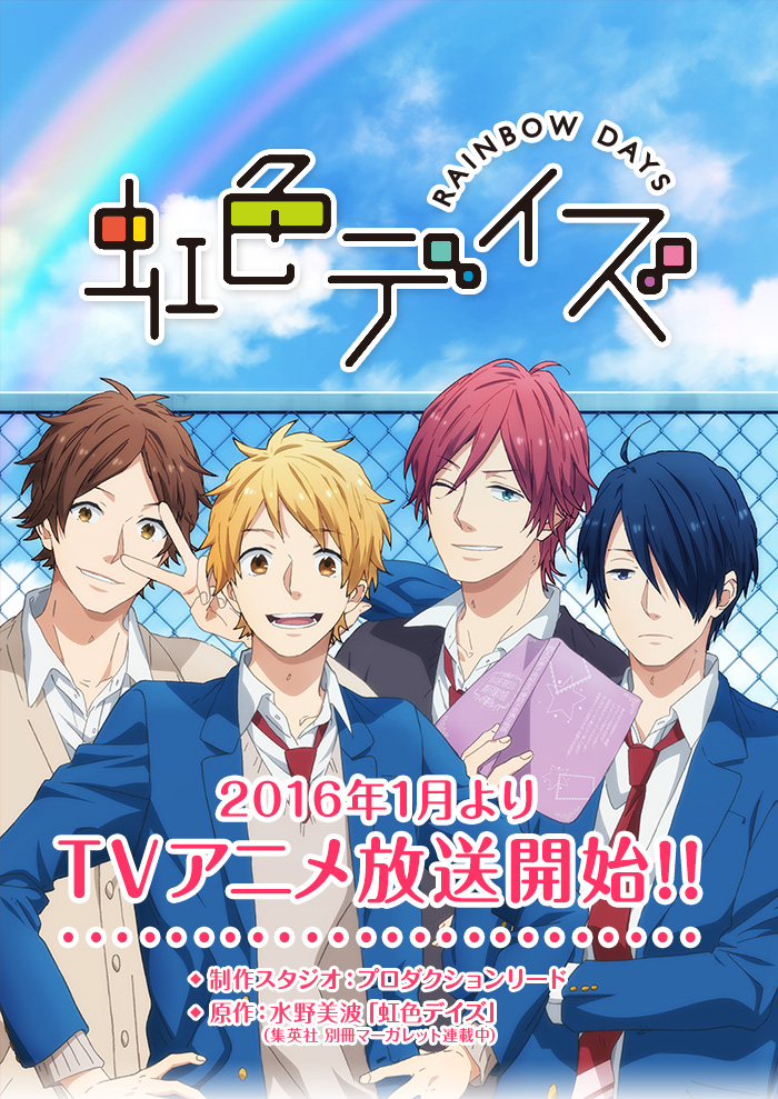电视动画《虹色时光》改编自水野美波原作的同名漫画,于2016年播出,全24话。作品讲述了夏树、智也、惠一、刚是无论何时都形影不离的高中生男子四人组。