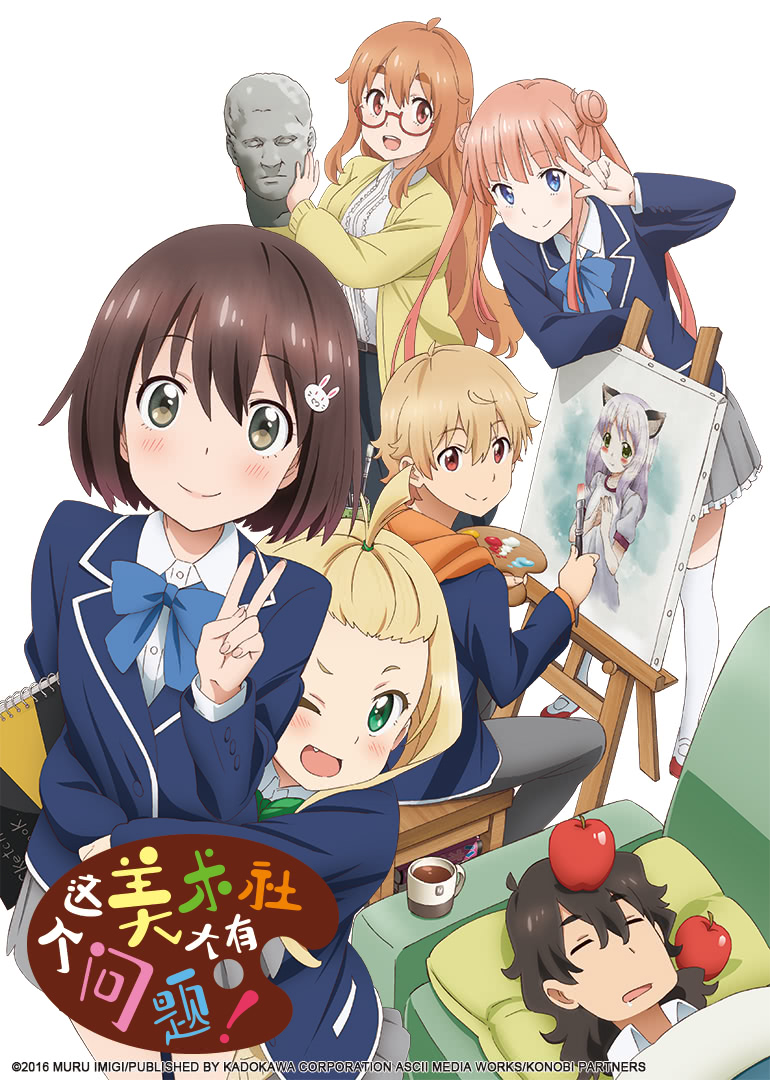电视动画《这个美术社大有问题!》改编自いみぎむる原作的同名漫画,于2016年播出,全12集。作品讲述了普通学校“月杜中学”的普通美术部,有着虽有绘画才能却只为了描绘理想的“二次元新娘”而燃起使命的内卷昴同学,以及对无可救药的内卷同学感到在意的宇佐美瑞希同学。以及,对两人似乎关注又似乎没有关注、总在睡觉的部长,和总带着不可思议气息的神秘部员可蕾特同学。这样稍微有些遗憾的人们所集中的美术部,今天也在发生着什么问题——