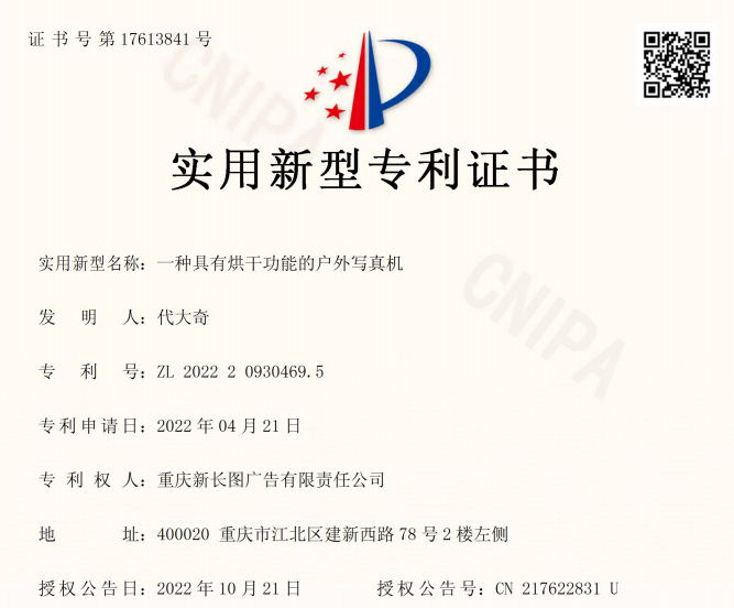 重庆新长图广告有限责任公司-2022209304695 -一种具有烘干功能的户外写真机.pdf