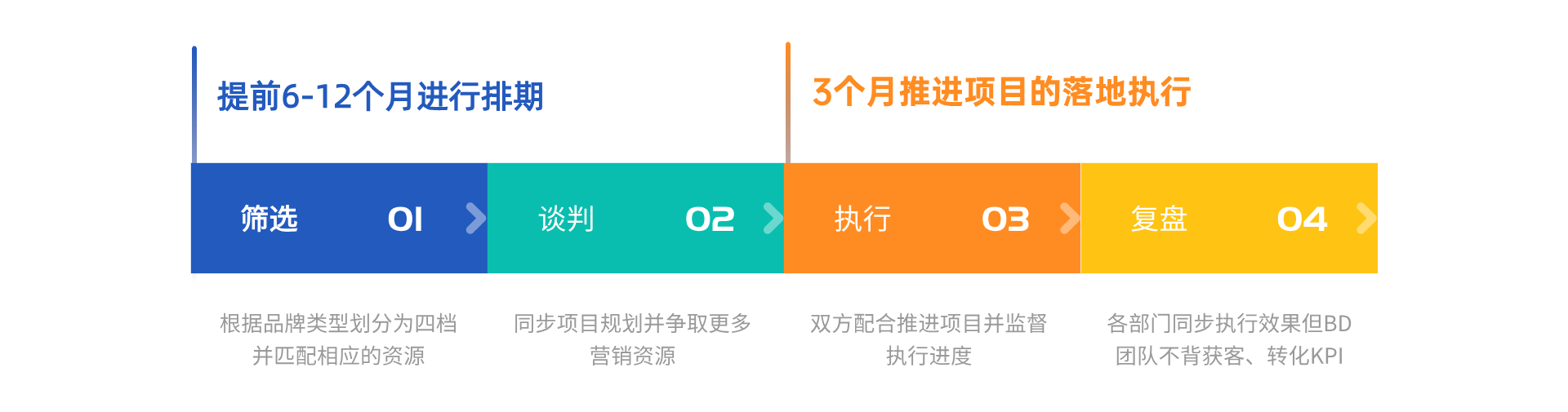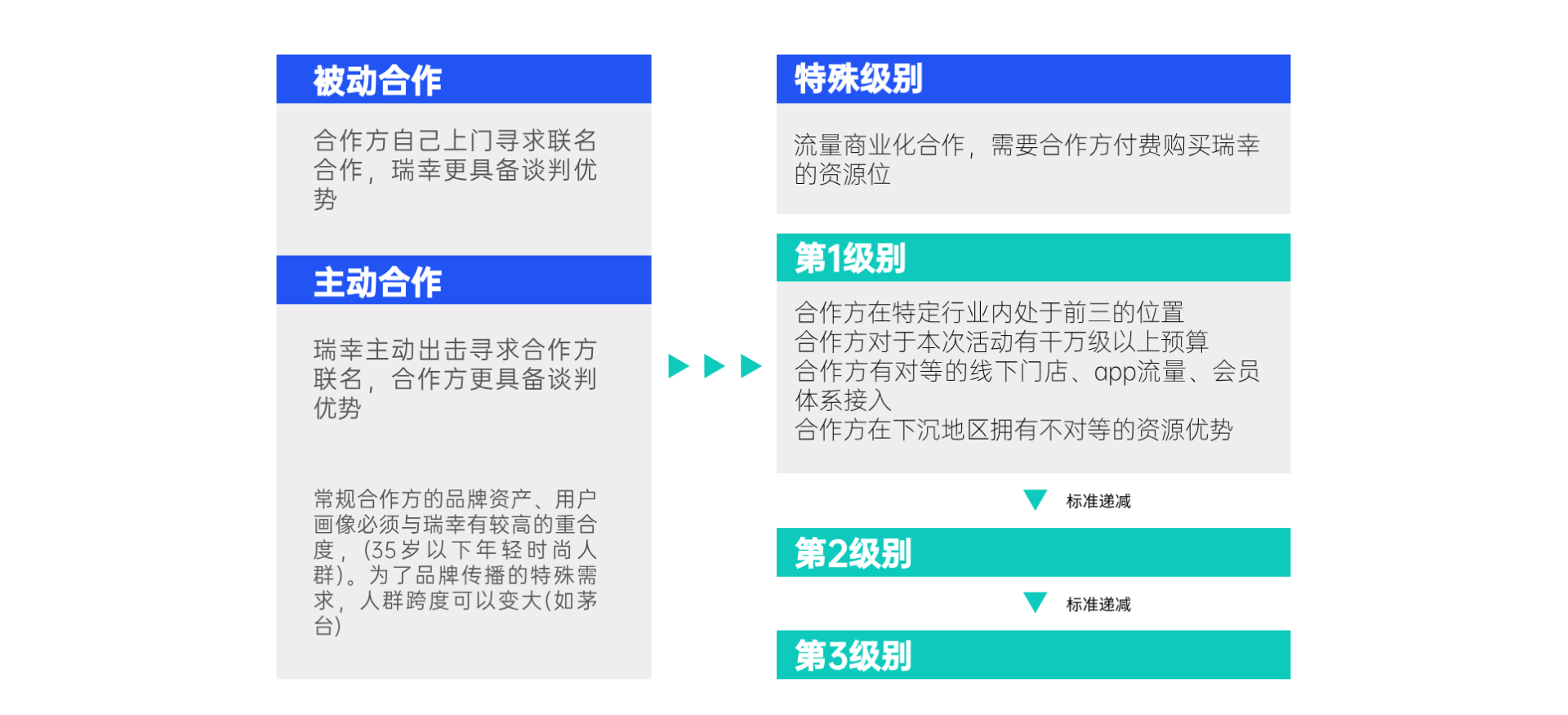 在筛选合作伙伴的时候,以人群为主要MATCH点,在合作上也有着一定的标准和要求,并依次递减。