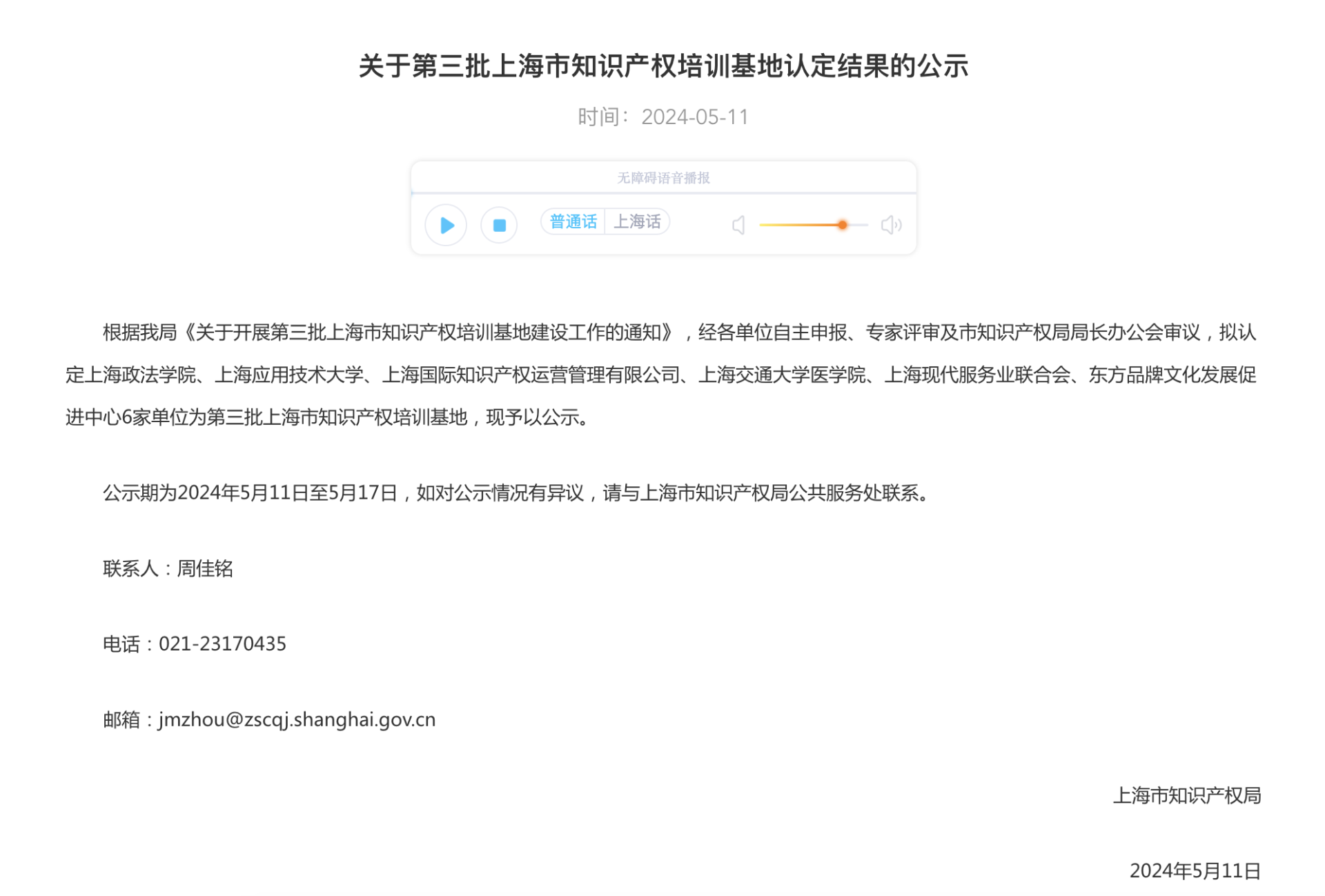 原文链接:关于第三批上海市知识产权培训基地认定结果的公示