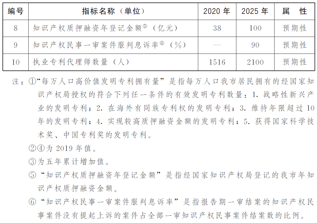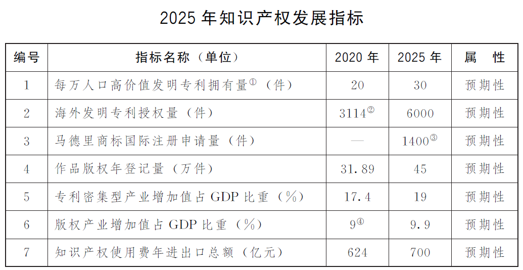 到2025年,知识产权制度建设进一步加强、保护体系进一步完善、质量效益进一步提升、服务功能进一步增强、国际合作进一步深化,国际知识产权保护高地基本建成。