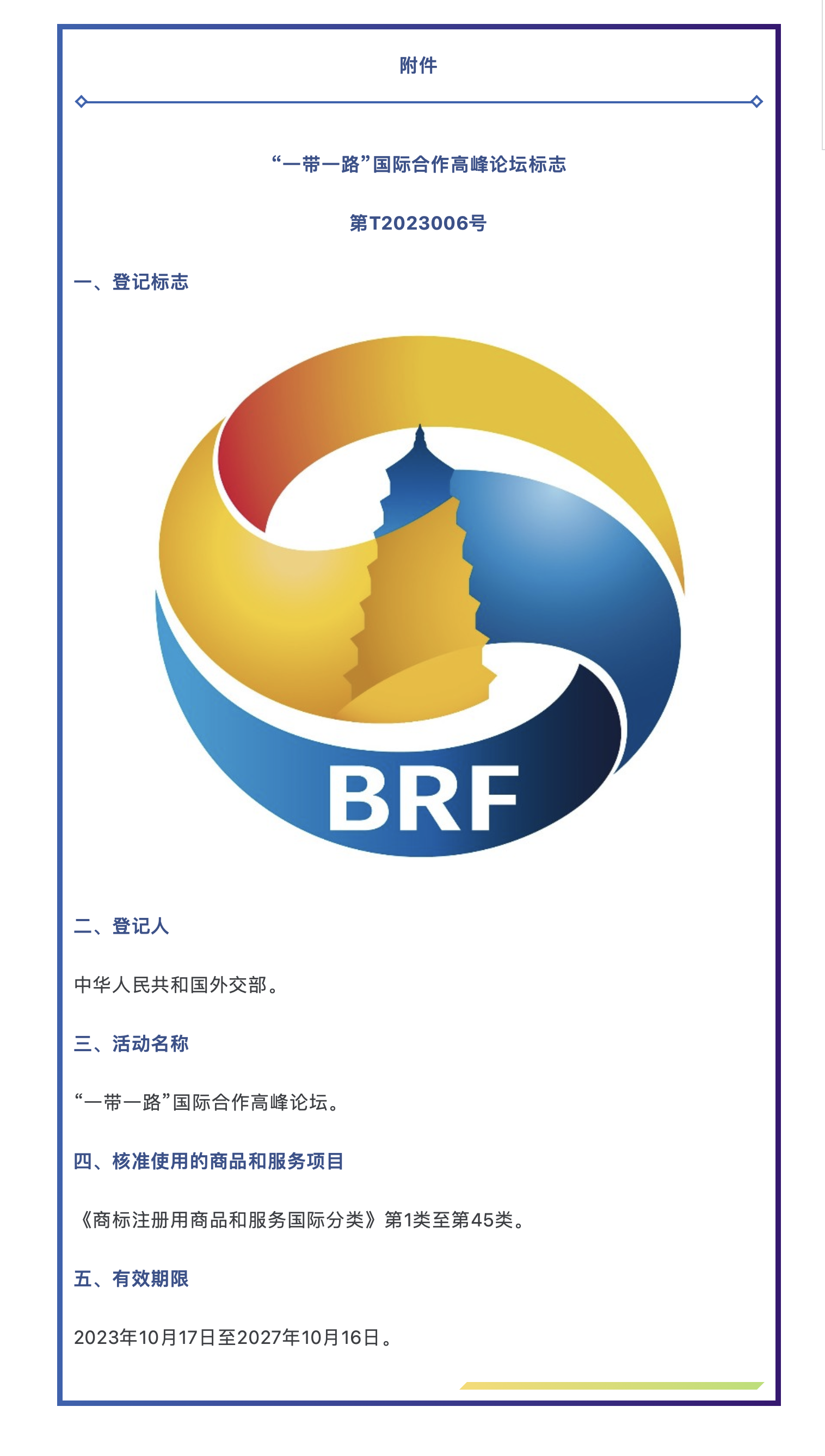 关于核准“‘一带一路’国际合作高峰论坛标志”特殊标志登记的公告