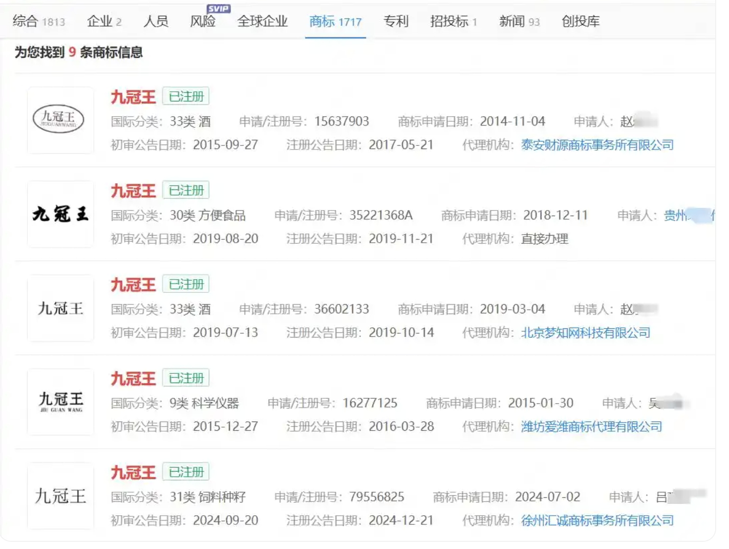 企查查APP显示,“九冠王”已被多位自然人及企业申请商标,其中5个为已注册状态。值得一提的是,“十冠王”也已被申请为商标。